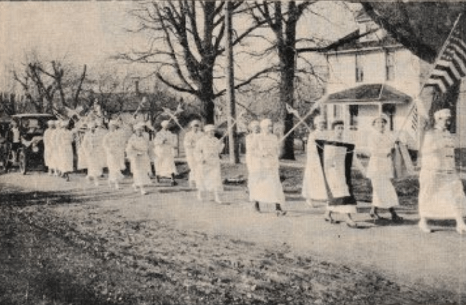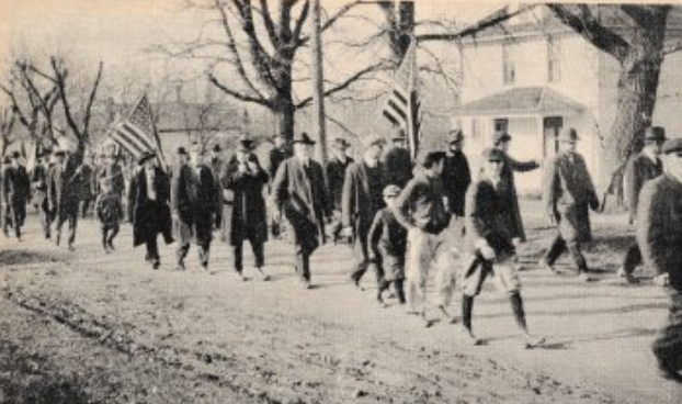 Within 30 minutes, people started marching down the streets of the town, with owners turning on the lights of their businesses and citizens turning on the lights of their homes to guide the way for the celebratory crowd. Around 1:30 in the afternoon the large parade started with about 1,500 people marching. Starting at village hall and working its way around the main streets of the town, it made its way back to the hall to finish. At the end of the parade, an effigy of Kaiser Wilhelm was hung from a telephone pole where it was summarily shot by some of the townspeople. At one point, car loads of people from Richmond and Spring Grove arrived to join in the celebration. The Richmond folks had a band that played some tunes before departing. There was a patriotic themed stage at the opera house, located above Pries’ store, where several of McHenry’s most prominent names spoke regarding the end of the war. However, the highlight of the evening was a large fire built just south of the village hall that was enjoyed by all. A McHenry band also came to the fire and provided some entertainment.