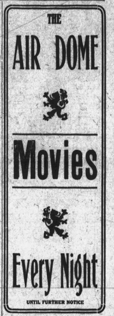 In the early 20th century a unique concept brought many popular forms of entertainment together. What became known as an “Air Dome”, held several different acts taken out of an indoor theater and put them outside. Rows and rows of chairs were set up in front of a stage or sometimes screen where the audience would then watch the performance. Being outside offered some distinct advantages. First in the summer months, being outdoors could be far more comfortable than being in a stuffy theater that didn’t have air conditioning. Also, being outside on a summer night offered a very pleasant ambiance. Singers, jugglers, vaudeville acts, and bands were some of the performers that one could see at an air dome. However, a relatively new technology seemed to be one of the most popular; motion picture films.