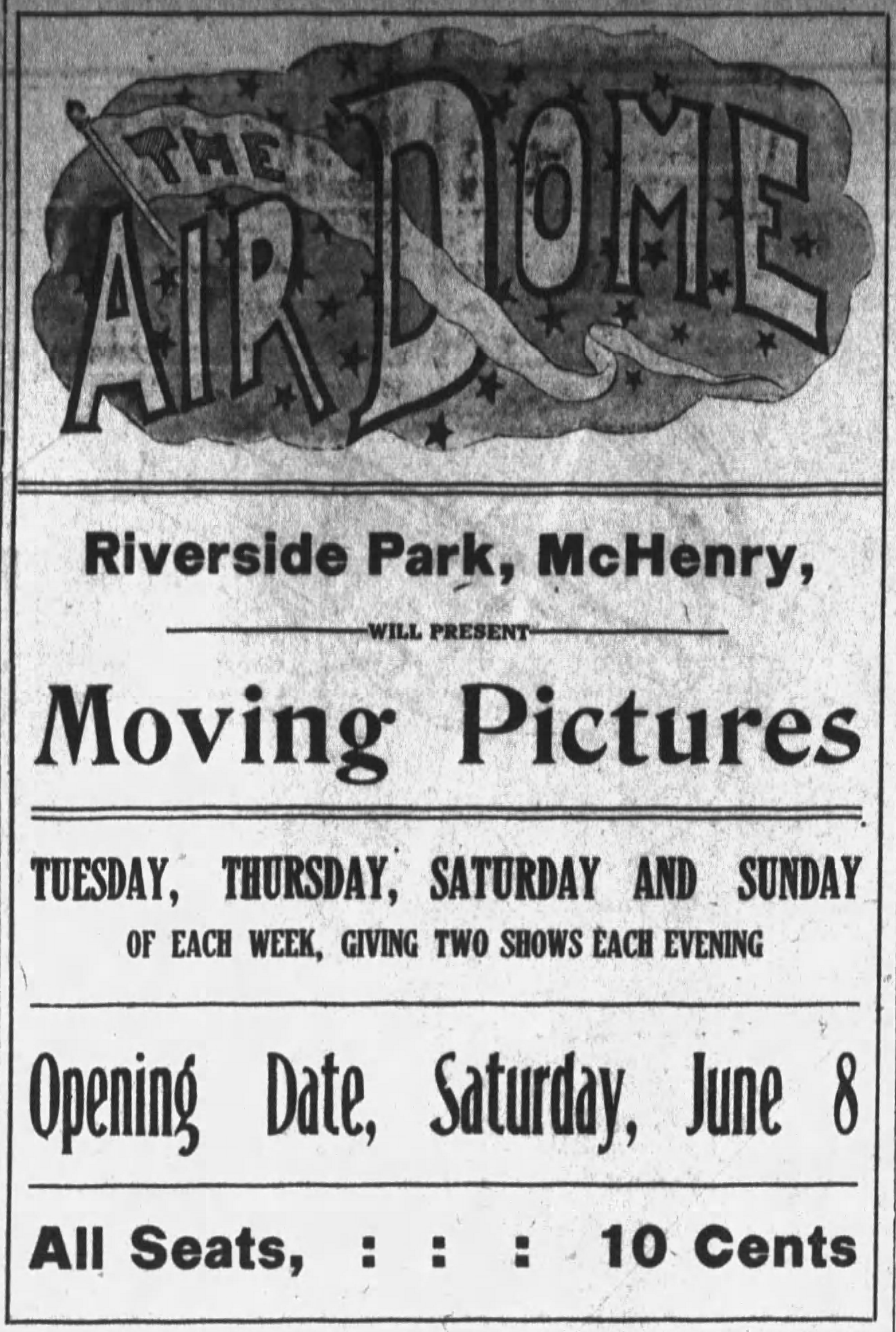 During this time, McHenry was a resort town, there were locally several forms of entertainment that were available and many places to get them. An Air Dome conveniently put them all together, yet McHenry’s mainly stuck with movies. It ran from 1912 through 1916, at the Riverside Park along the Fox River. The River offered an ideal place with some great scenery. Also, being about a mile north of town, it was quiet and dark enough for showing films. The Air Dome was run by John W. Smith, a veteran theater operator and performer. Smith ran the theater in McHenry’s Central Opera House and would run the Empire Theater for many years. The Air Dome borrowed 5 pieces from the Central Opera House orchestra for the music played during the movie. Movies and other things, such as lighting, that required electricity had a line run to them. So goes life with outdoor activities. Yet, Smith then purchased a cover for the dome, how large the cover was and how often it was used, wasn’t noted. The Dome was open for business on Tuesday, Thursday, Saturday, and Sunday evenings at a cost of 10 cents. For the 1913 season, John Montgomery was brought in to run the films as the Air Dome was open every night of the week. He was an electrician who had experience operating movies in Chicago. During a particularly bad storm, power was poor enough to cancel the Sunday show.