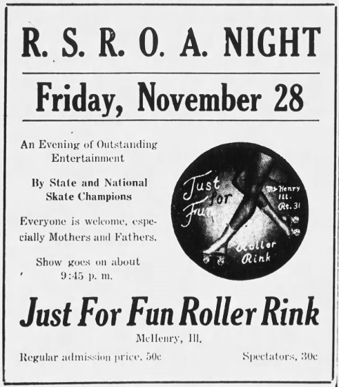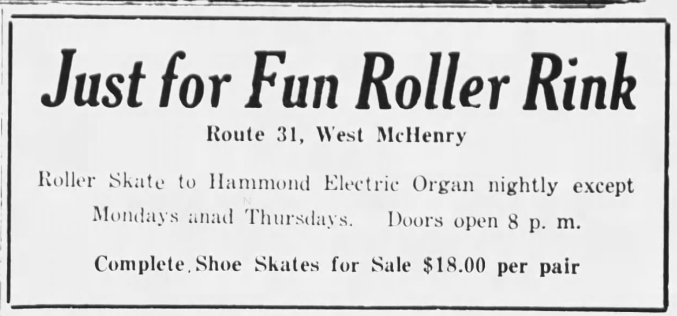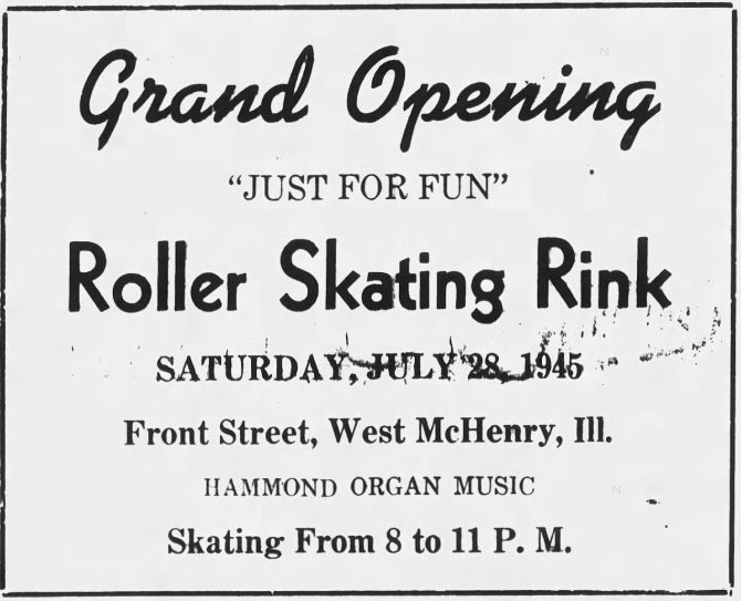 - “Just For Fun Skating Rink To Open July 28” The McHenry Plaindealer. 19 Jul 1945, 1. Newspapers.com. Web. 6 Aug 2020.