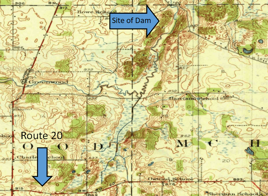 The dam, when built, would keep the water 800 feet above sea level and would be quite the feat of engineering. It would be constructed by the Whitewater Bridge Company from Whitewater, Wisconsin and engineered by Randolph-Perkins company from Crystal Lake. The dam measured over 1000 feet long and dropped down 25 feet and measured in thickness of two and 1/2 feet thick to one foot thick. The spill way, the part of the dam the controls where the water goes downstream, measured 150 feet long. The rest of the dam consisted of an enormous fill of clay. The construction started in June and was finished in October. The top had a walkway for inspections and flash boards were included at the top to help adjust the depth of the lake if desired.