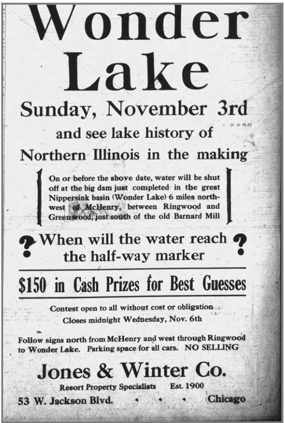 In February 1929 it was announced that the company of Jones & Winter would be building a giant man-made lake. When finished it would be the second largest lake in Northern Illinois. Jones & Winter was a company from Chicago, that specialized in summer resorts. They announced the name of the development would be Wonder Lake. The lake would offer the best place for water activities, such as boating, swimming, and fishing. They would also develop land for summer and year-round residences. However, what would be so impressive about the lake would be its size, as nothing like this had been done in the Mid-West.