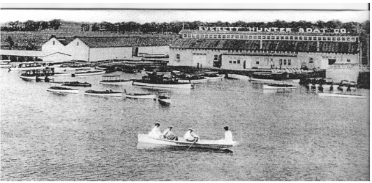 During McHenry’s heyday as a resort town, one of the most popular attractions were the lotus beds at Fox Lake, Pistakee Lake, and Grass Lake. Seeing a great business opportunity, Chicagoans, Everett Hunter, and A.J. Weckler, set up a boat factory in Fox Lake in 1904. The factory was a temporary one, as they had their eyes on setting up a much bigger site in McHenry if things went well. Things looked to go very well as the scenic Fox River was the preferred way to get up to the lotus flowers and other attractions. Testing the market, Hunter and Weckler, started making boats and had a great season. They sent the next two years selling boats from their Fox Lake location, keeping their offices in Chicago, and planning their large factory in McHenry that would function as both factory and office. Most in town were very much in favor of having such a prosperous business here, and many of the town leaders worked with Hunter & Weckler to get them to keep their sights on McHenry as the future home of their boating company.