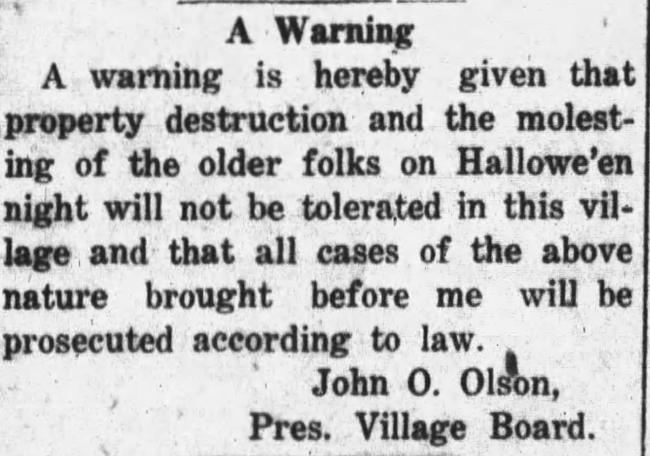 Many older, and probably influential citizens of the area didn’t appreciate all these shenanigans, and often wrote to the newspapers voicing their displeasure. It wasn’t uncommon to see pieces in the newspaper following Halloween with threats of legal action, if offending parties didn’t fix or pay for repairs to damaged property. What became even more common were notices from local law enforcement strongly discouraging any behavior that would damage property. This included putting patrols out on Halloween night. While this seemed to be rather commonplace, the patrols seemed to take a more serious tone going into the 1910s. What had been gentile nudging from local newspaper editors and citizens shaking their fingers about the possible consequences of destroying property, had evolved into sheriffs bluntly saying that there would be legal ramifications. By about 1915, is was usually noted that only a few pranks had been pulled and those were relatively tame. At this time, Halloween took on its more familiar party throwing, trick-or-treating event we know today.