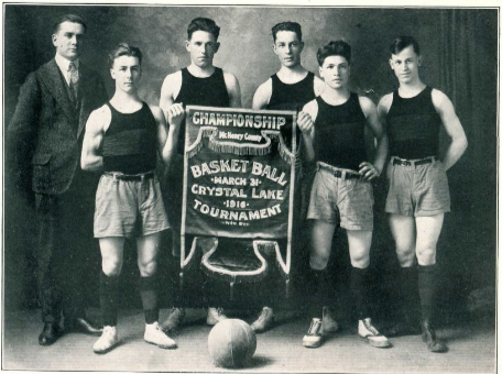 Going into the 1915-16 basketball season, the boys McHenry High School team weren’t optimistic about their chances. The previous season, 1914-15, the team did very well, winning the McHenry County tournament. Yet, the team lost all but one of their players to graduation. However, just as important, Phillip Dorr was returning as the team’s coach. Well respected and liked by his players, Mr. Dorr knew how to get the best out of his players. McHenry was noted as being a fast team that was accurate in their shots. The team consisted of Alfred Richardson, Edward Bonslett, Lester Bacon, Henry Miller, and Frank Justen. Bonslett lead the team with 88 points scored during the year, with Alfred Richardson close behind with 84.
