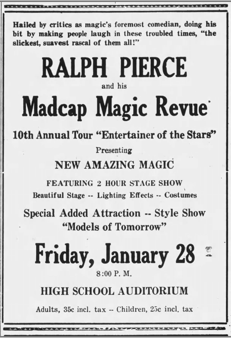 - “Ralph Pierce, the Magician, Will Appear Apr 1” The McHenry Plaindealer. (McHenry, IL) 31 Mar 1949, 1. Newspapers.com. Web. 17 Nov 2022.