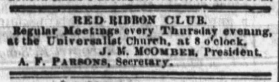 Starting in 1872 in Maine as the Blue Ribbon Club, the group became the Red Ribbon Club in 1874. Women would form their own group, the White Ribbon Club, and run their own meetings. During the next few years, the club spread throughout the country, mainly through charismatic speakers. Members were sworn to sign an oath or take a pledge and wear a red ribbon showing their dedication to the cause. The White Ribbon Club also was against the use of tobacco. In some areas, people would combine their ribbons, red & white, to show their solidarity against both alcohol and tobacco. The Clubs have a few aspects of their message, that made them very popular. One was that they saw the abuse of alcoholic beverages as part of a larger societal problem and didn’t blame the individual. Also, as noted in a Chicago Daily Tribune article, the Clubs kept two things out of their message that most temperance organizations discussed: politics and religion.