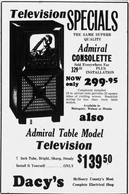 - “Admiral Portable Radios Centers In McHenry.” The McHenry Plaindealer. (McHenry, IL) 29 Apr 1948, 1. Newspapers.com. Web. 17 Jan 2025.